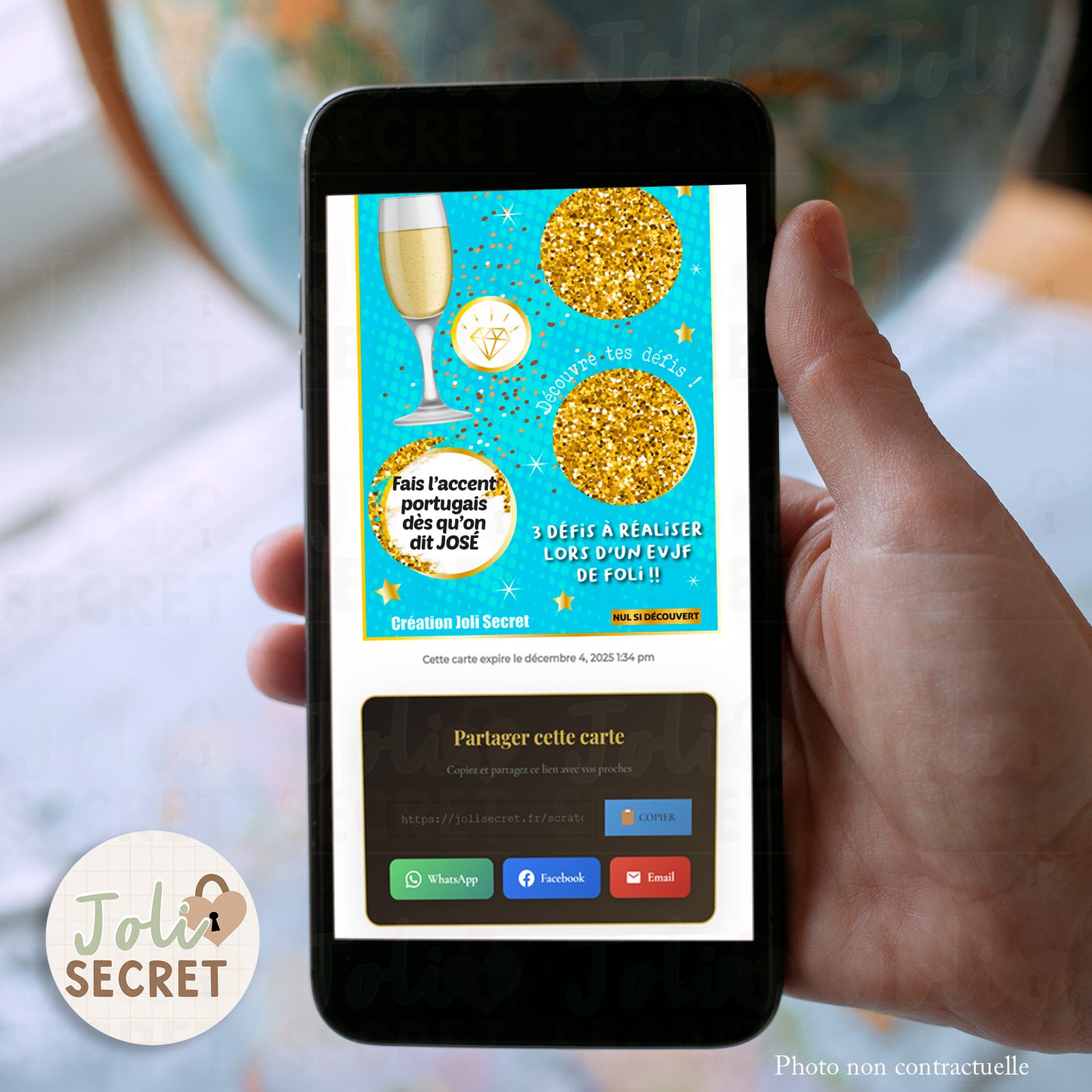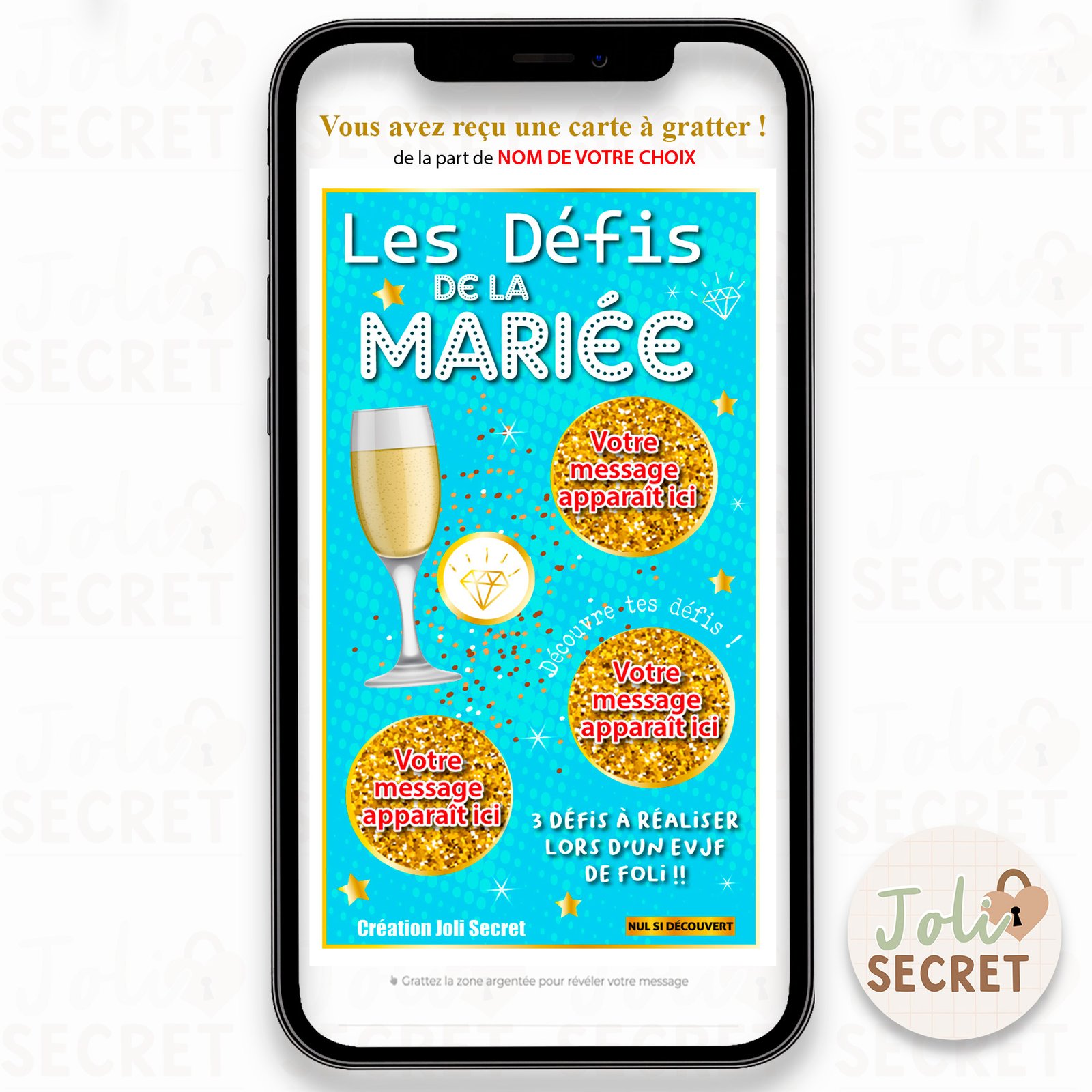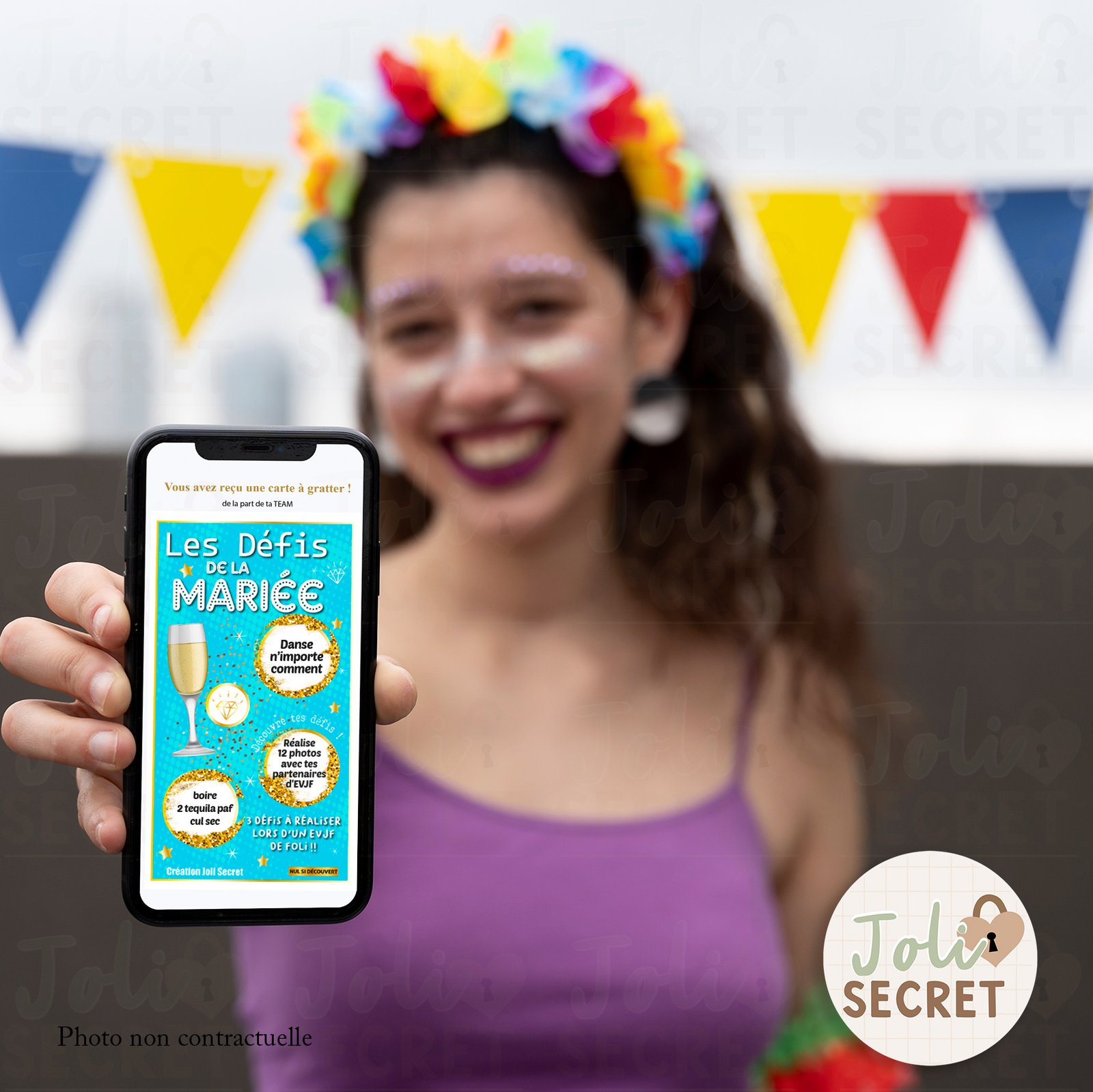 Découvrez notre Animation EVJF originale – défis à gratter virtuels mariée. Un jeu interactif  et rafraîchissant pour pimenter votre journée d’EVJF !