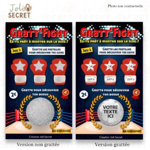 Le thème Bonne Aventure est la touche d’originalité de cette fiche produit. L’illustration de la voyante avec sa boule de cristal captive l’attention et garantit un effet dramatique au moment du grattage. C’est le moyen le plus original et interactif de partager une annonce surprise !