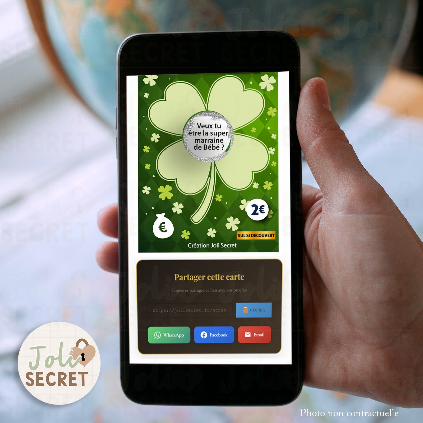 Carte à gratter digitale à personnaliser en un clic, à gratter sur smartphone et à partager à qui vous voulez. Annonce grossesse, parrain/marraine, ou surprise Chance Trèfle !