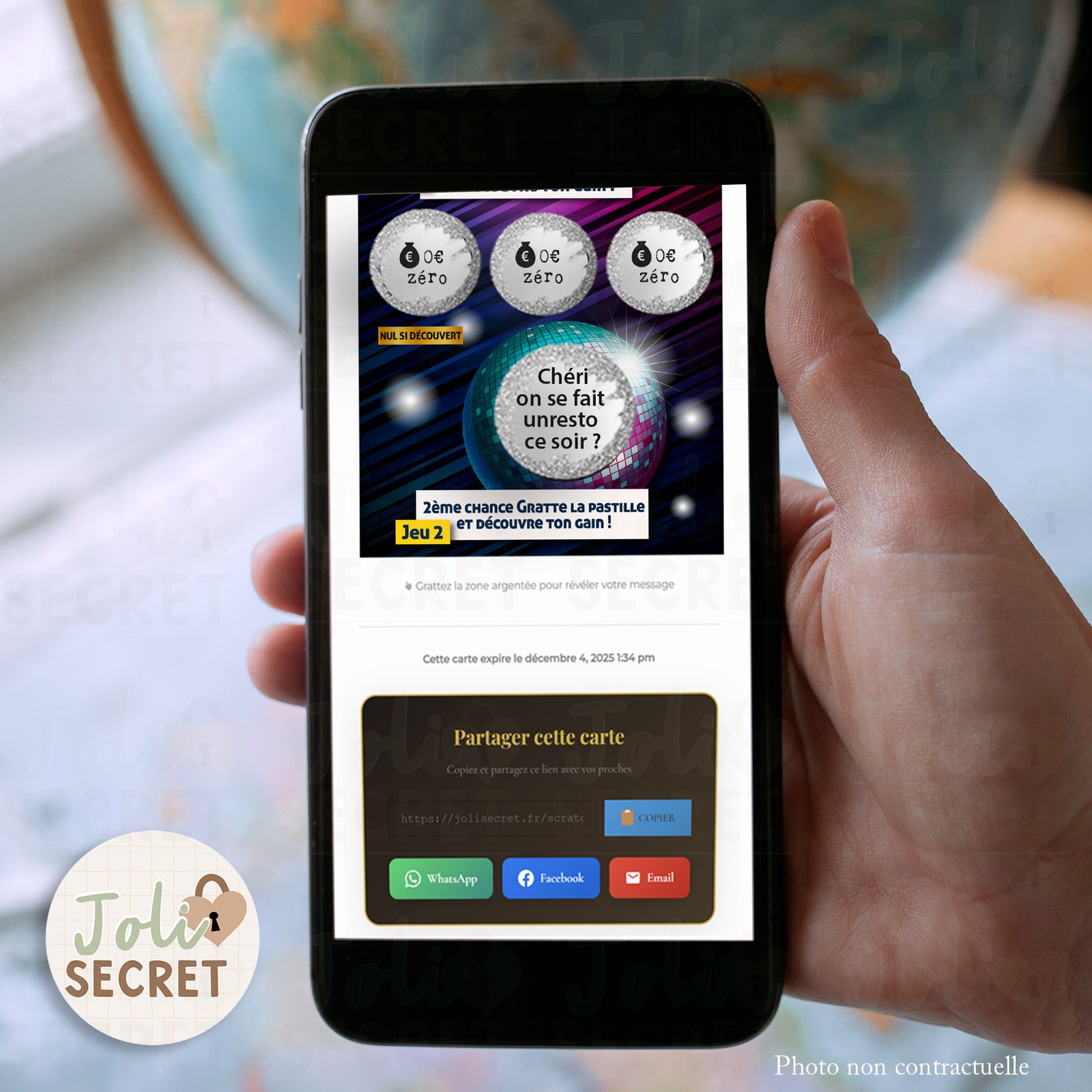 3. L’émotion du grattage : Votre proche reçoit le lien, gratte virtuellement l’écran de son téléphone et découvre votre annonce avec émotion.