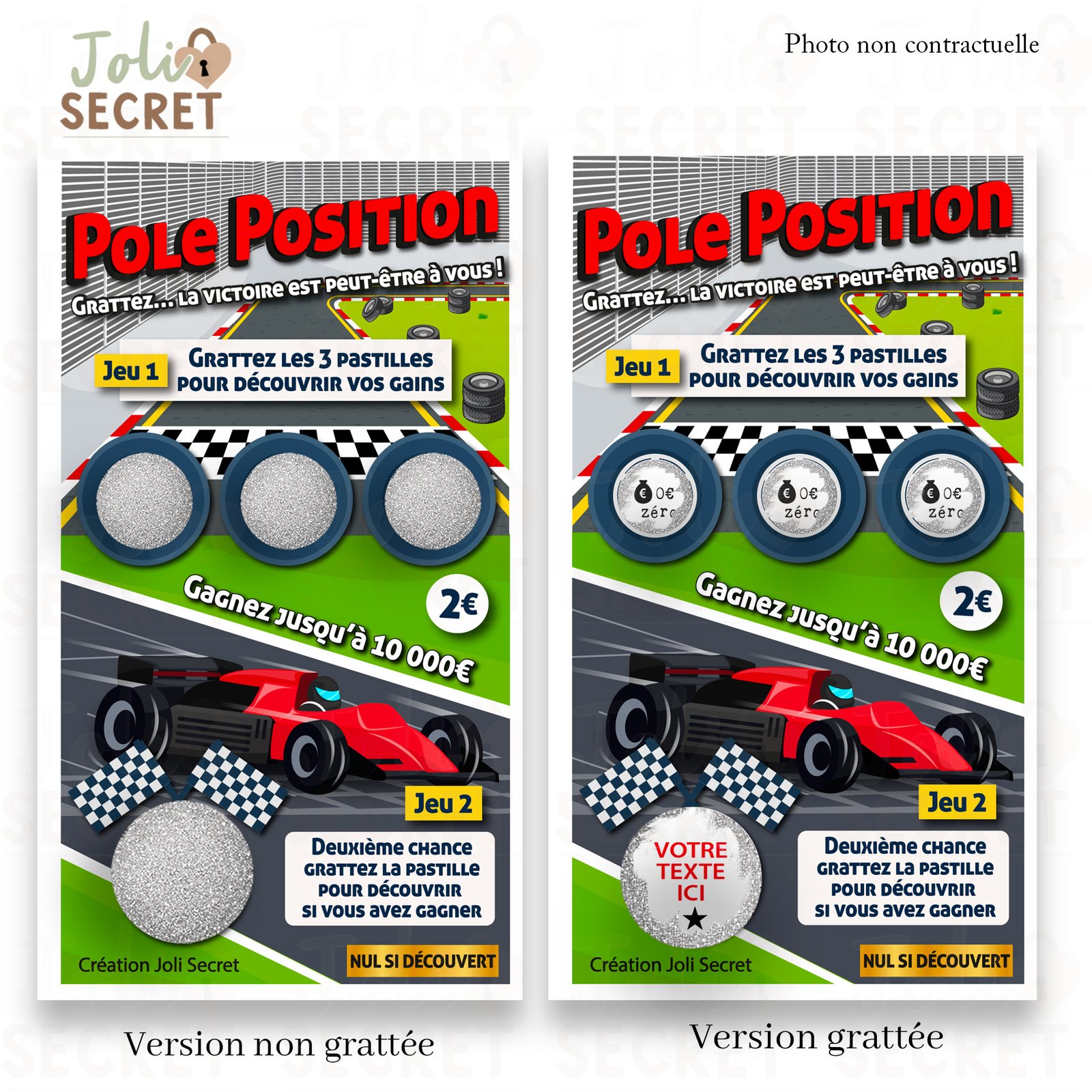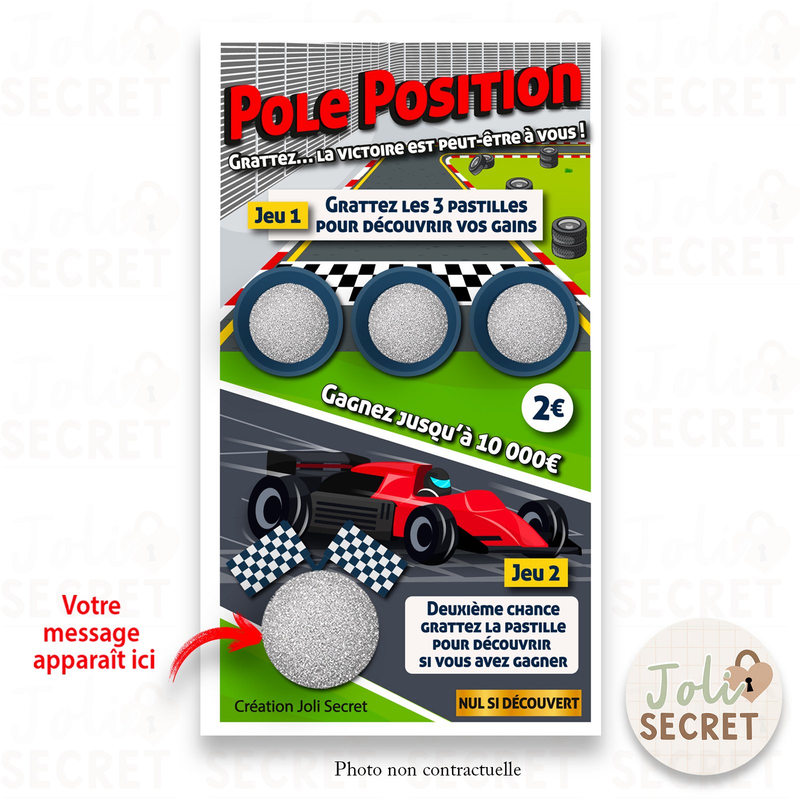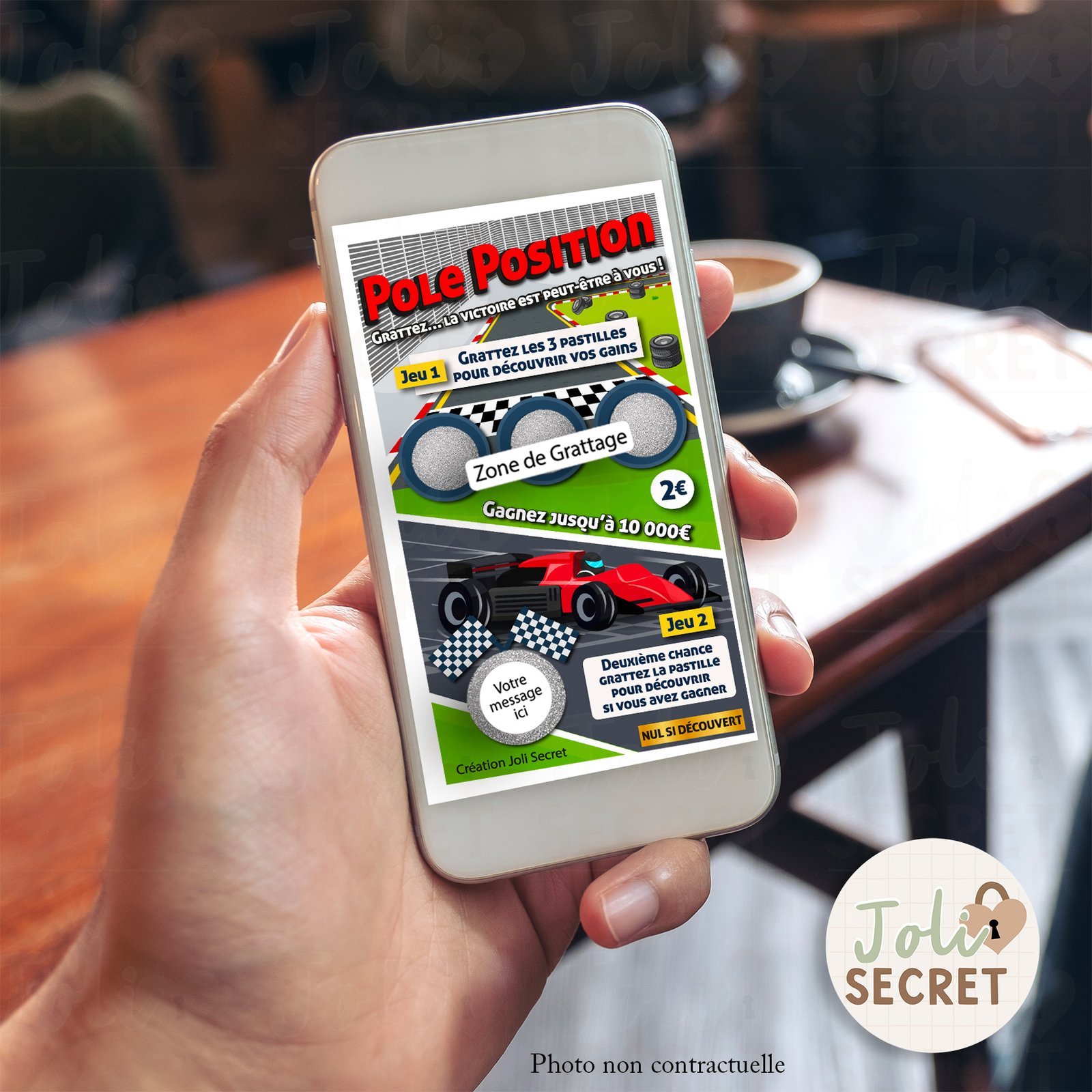 Ce Jeu à gratter numérique – Annonce personnalisée voiture, inspiré de l’univers de la course automobile (Pole Position), est conçu pour révéler vos plus belles annonces et surprises de manière interactive, dynamique et inoubliable. En quelques secondes, votre proche ouvre le jeu, gratte les pastilles et découvre votre message personnel caché derrière la ligne d’arrivée. Un format 100 % digital, fun et moderne, qui garantit un effet de surprise maximum.