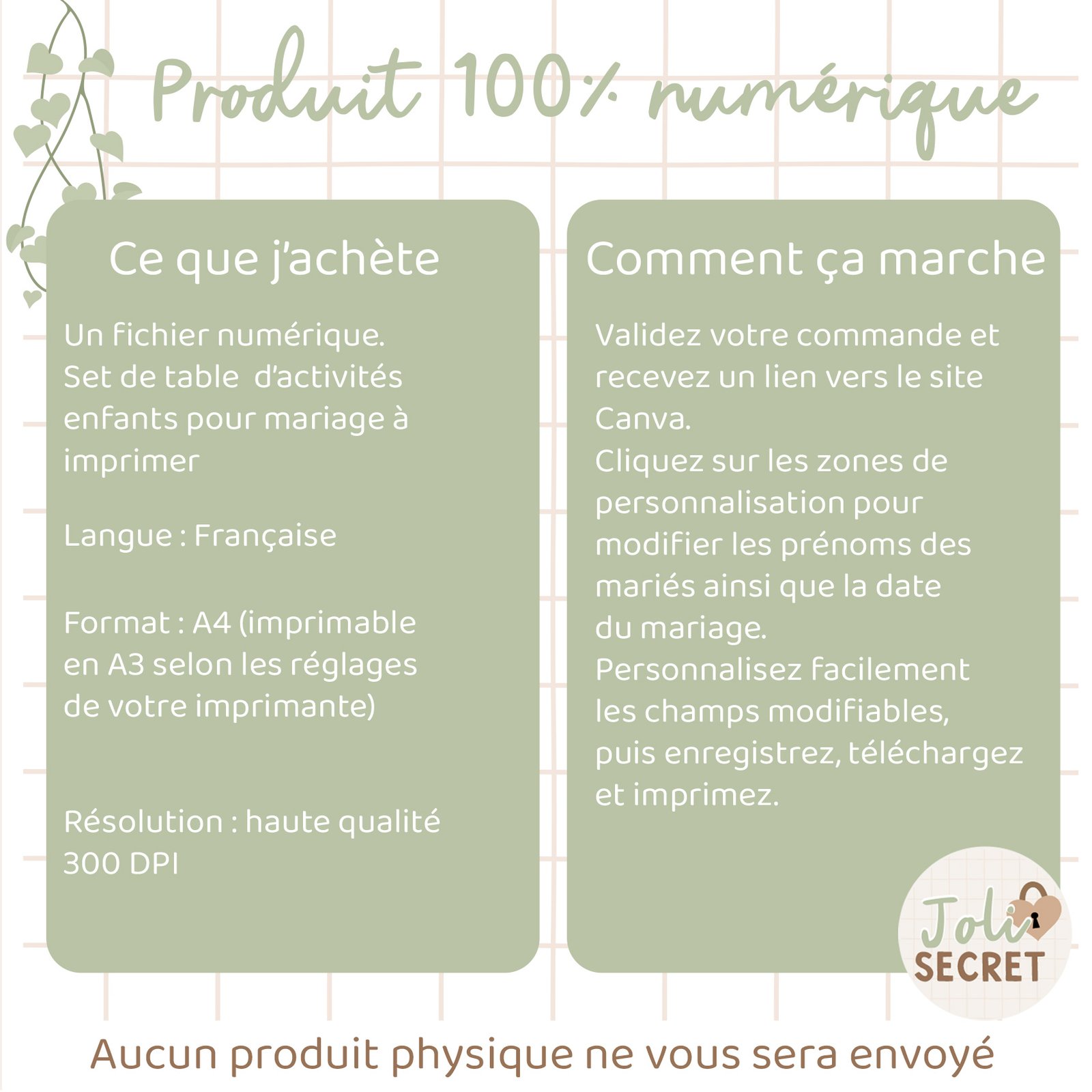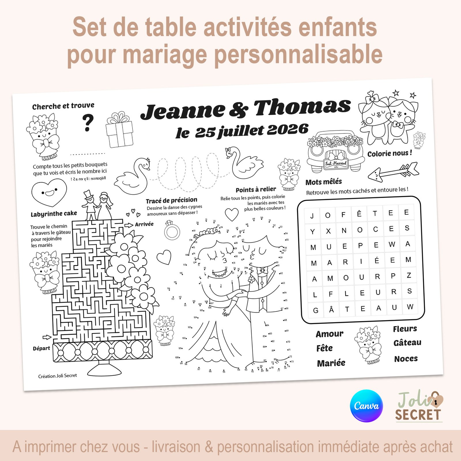 Jeux enfant mariage à imprimer – Set d’activités personnalisable (Canva)
