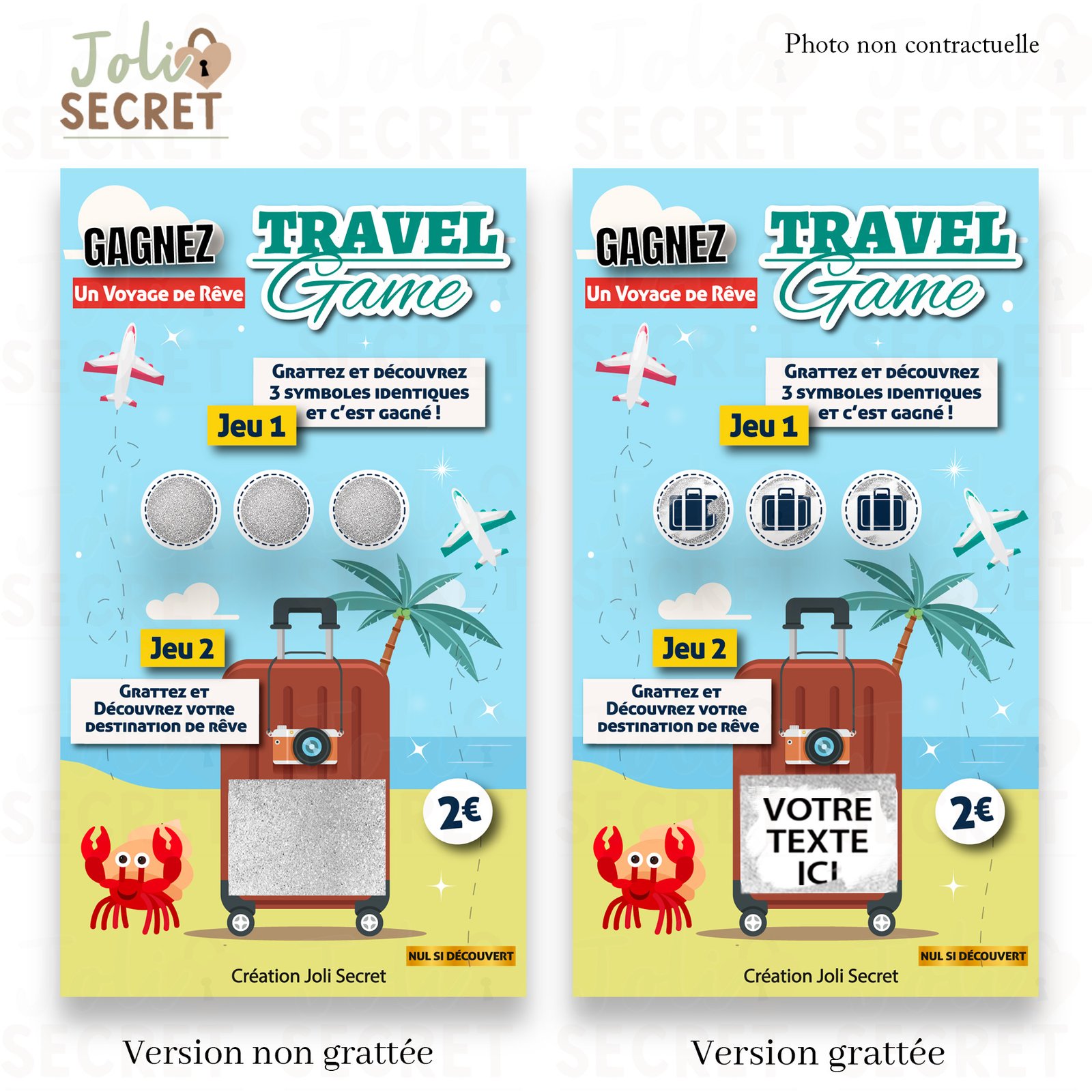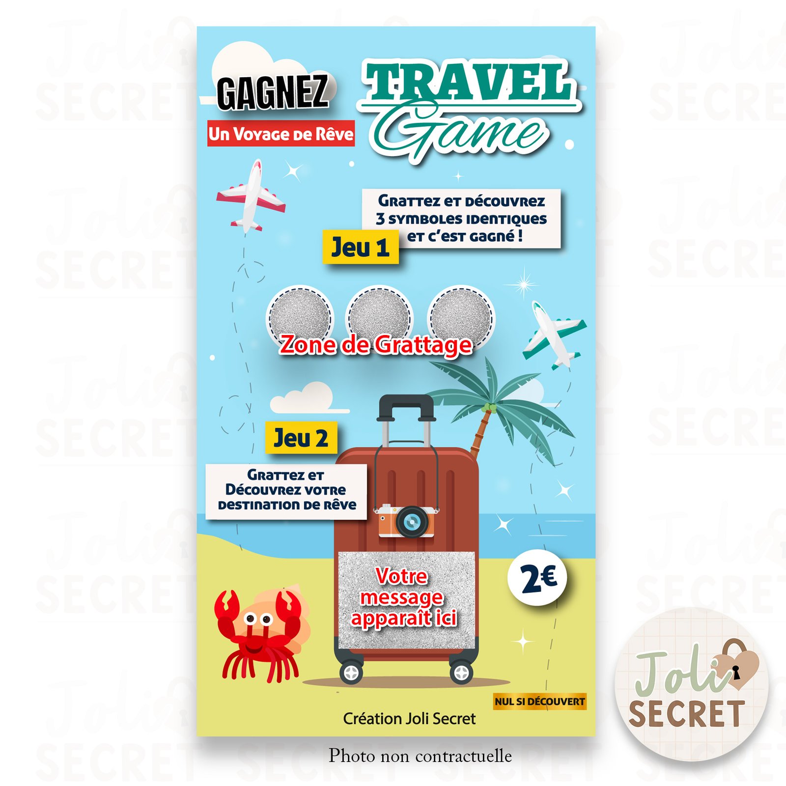 Créée en haute résolution (1080 × 1920 px), cette Ticket à gratter numérique voyage surprise est optimisée pour une expérience parfaite sur tous les supports (smartphones, tablettes, ordinateurs).