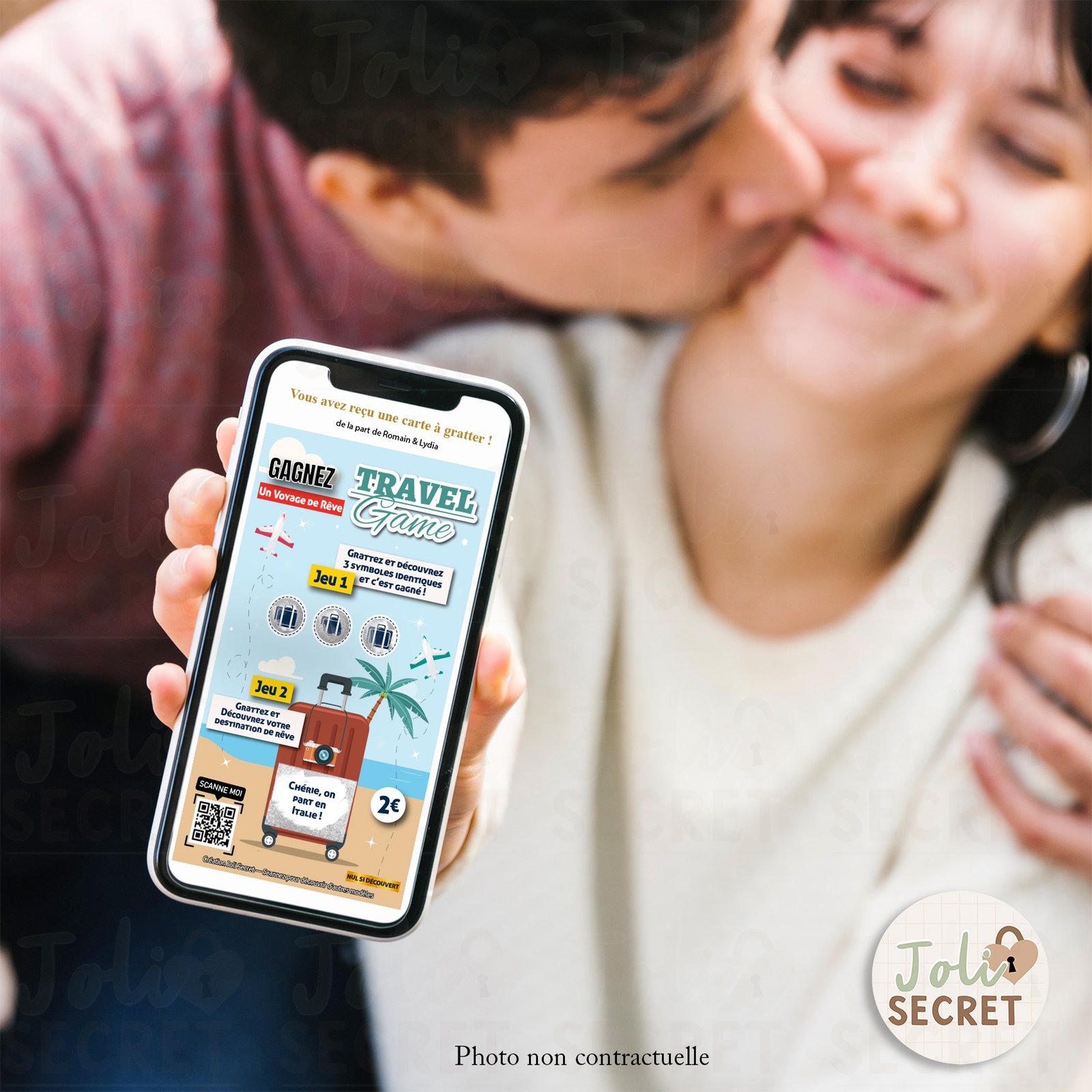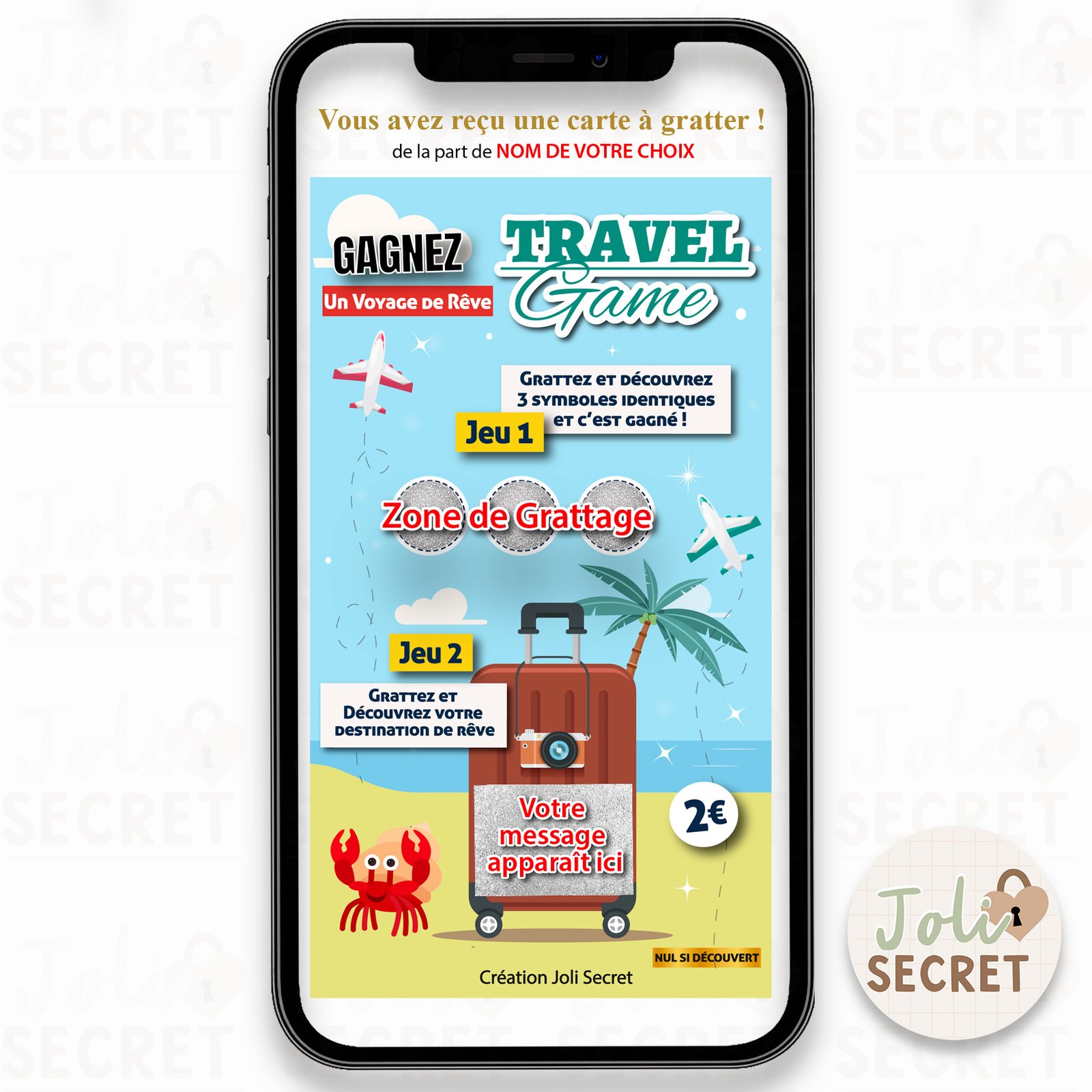 La Révélation de la Destination (Jeu 2) : Il doit ensuite gratter la zone centrale de la carte. Cet acte, effectué avec le doigt sur l’écran, est le moment fort qui révèle la destination de rêve ou le cadeau surprise que vous avez préparé ! L’émotion est garantie lors de la découverte de votre message.